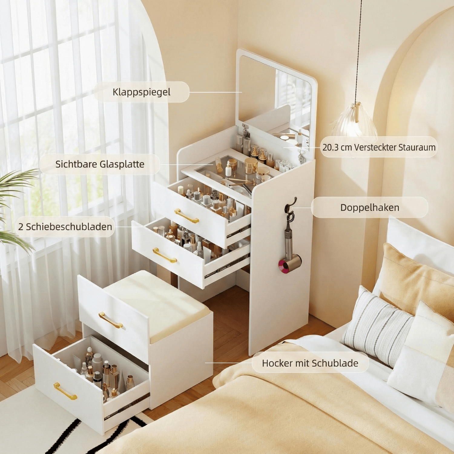 Dieses kompakte 3-in-1 Möbelstück kombiniert Schminktisch, Nachttisch und kleinen Schreibtisch in einem durchdachten Design. Ideal für kleine Räume, in denen Funktionalität und Ordnung gefragt sind.